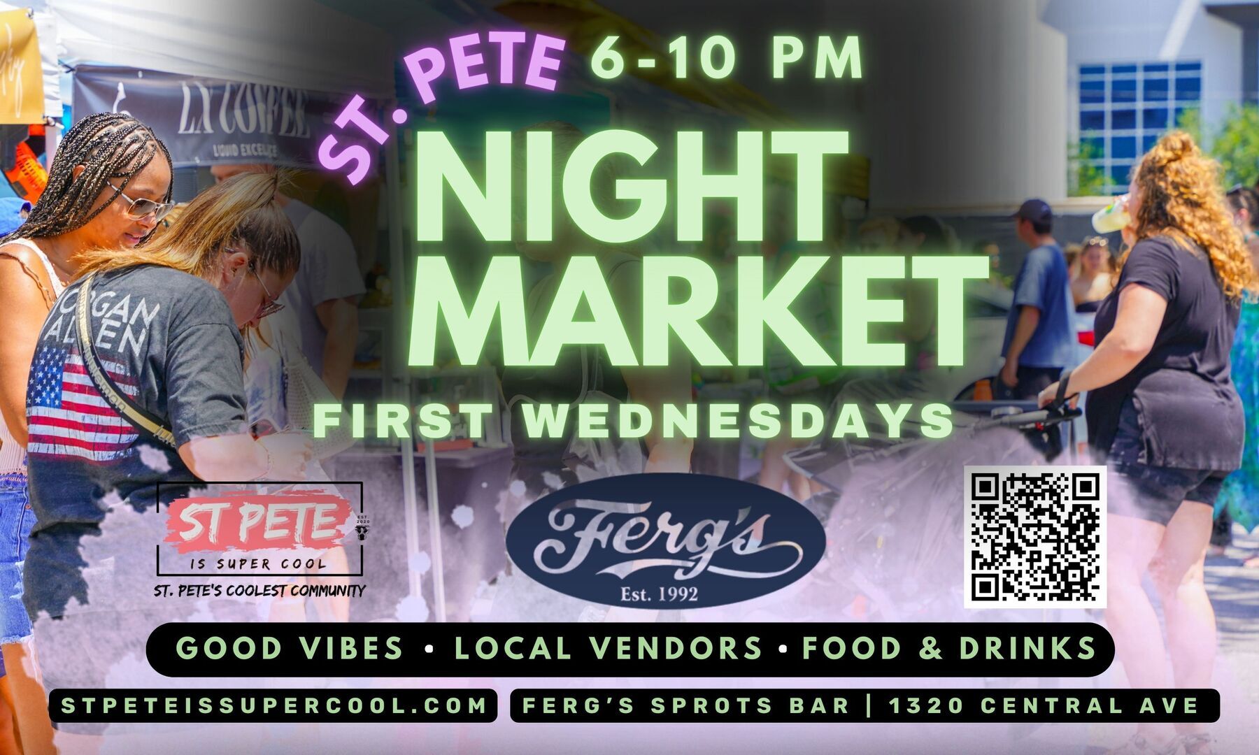 St. Pete’s favorite midweek night out is lighting up downtown every First Wednesday! Hosted at Ferg’s Sports Bar, the Night Market transforms the space into a bustling hub of local shopping, live music, and after-dark vibes!