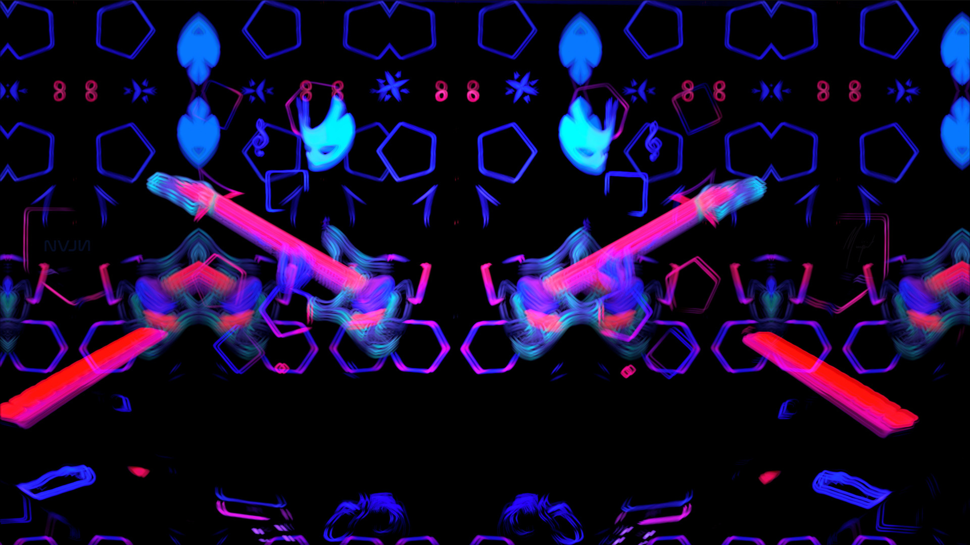 This concept begins when Muzicianist writes and plays a song. He is mostly invisible, defined by the luminous energy of his mask, hands and feet. By using a UV-reactive background and light-based costume, his guitar and body movements are video captured. Afterwards, filters and visual effects are used. Finally, the video is deconstructed frame-by-frame, into a series of still images for print.