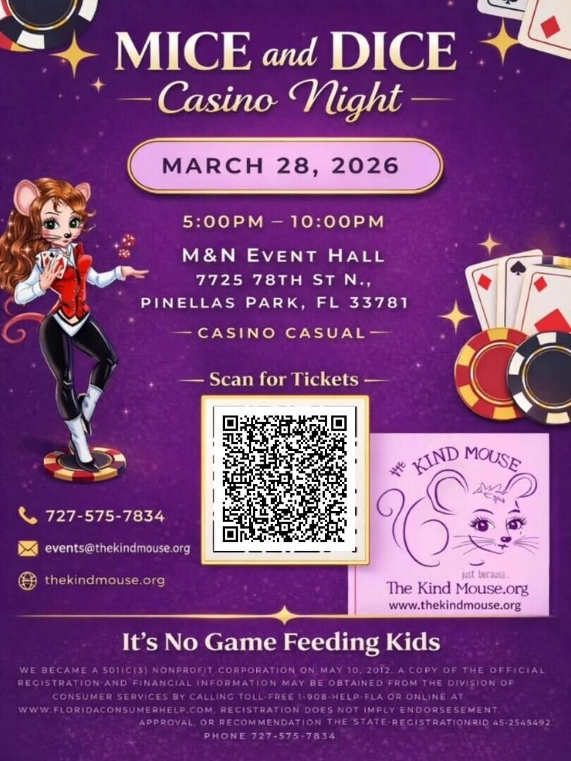 Join us for Mice & Dice, a night of fun, games, and giving back! We can’t wait to roll the dice with you as we raise critical funds to support chronically hungry and food-insecure children in Pinellas and Manatee Counties.