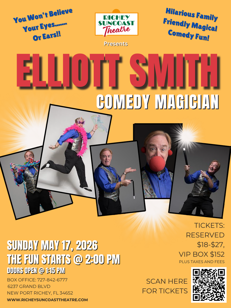 NEW PORT RICHEY, FL — On Sunday, May 17, 2026, at 2:00 PM, the historic Richey Suncoast Theatre presents four-time award-winning comedy magician Elliott Smith. Smith brings a world-class blend of comedy magic and wit that has captivated audiences globally for over 45 years.