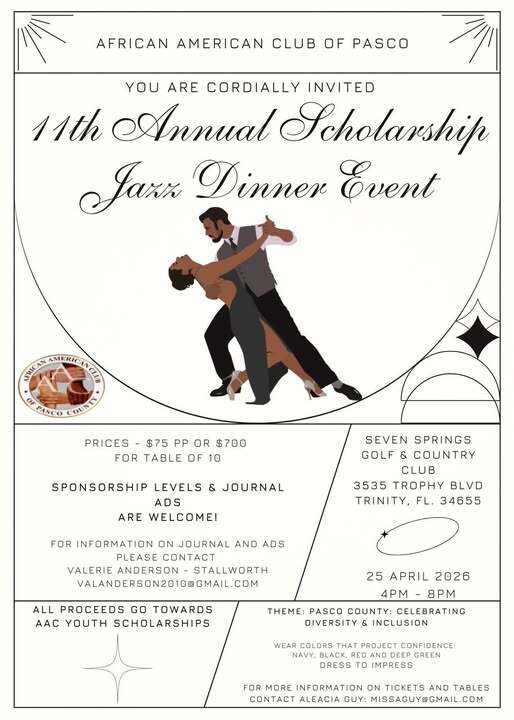 This Annual Scholarship Fundraiser Jazz-Themed Dinner Event brings members, supporters, and community leaders together to raise monies for deserving Pasco County High School Students. Enjoy a delicious meal, live music dancing, raffles and auctions. Suggested Attire: Wear colors that project confidence, such as navy, black, red, and deep green. See you there!