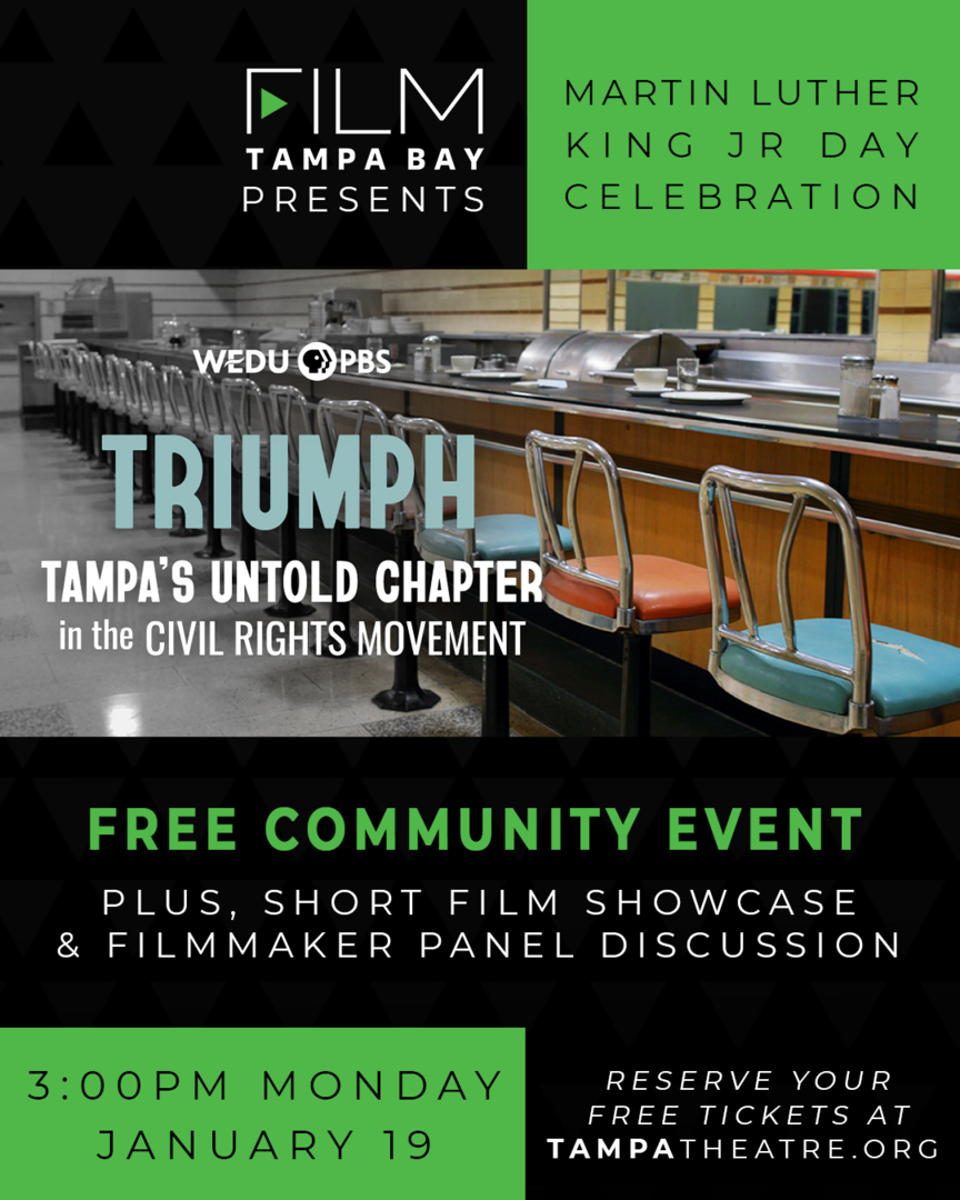 Film Tampa Bay Presents is a quarterly series designed to showcase Tampa Bay-area films, filmmakers, actors, and locations through FREE community screenings at Tampa Theatre. This special Martin Luther King Jr. Day event includes a selection of previews of upcoming films, short films curated by writer and filmmaker Cranstan Cumberbatch, and a screening of the WEDU feature documentary TRIUMPH: Tampa’s Untold Chapter in the Civil Rights Movement.
