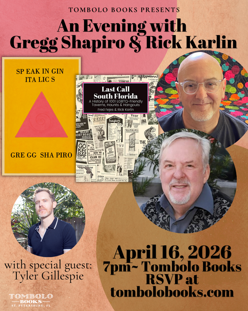 Gregg Shapiro is the author of 10 books including Speaking in Italics (Souvenir Spoon Books, 2026). Recent/forthcoming lit-mag publications include Pleiades, Bronze Bird Review, Oatleaf Poetry Magazine, Gargoyle, and BarBar, and anthologies White Winged Doves: A Stevie Nicks Poetry Anthology, America's Future: Poetry & Prose in Response To Tomorrow, and Visiting Joni: Poems and Short Prose Inspired by the Life and Work of Joni Mitchell. An entertainment journalist, whose interviews and reviews run in a variety of regional LGBTQ+ and mainstream publications and websites, as well as an anchor on Queer News Tonight, Shapiro lives in South Florida with his husband Rick, and their dog Coco.