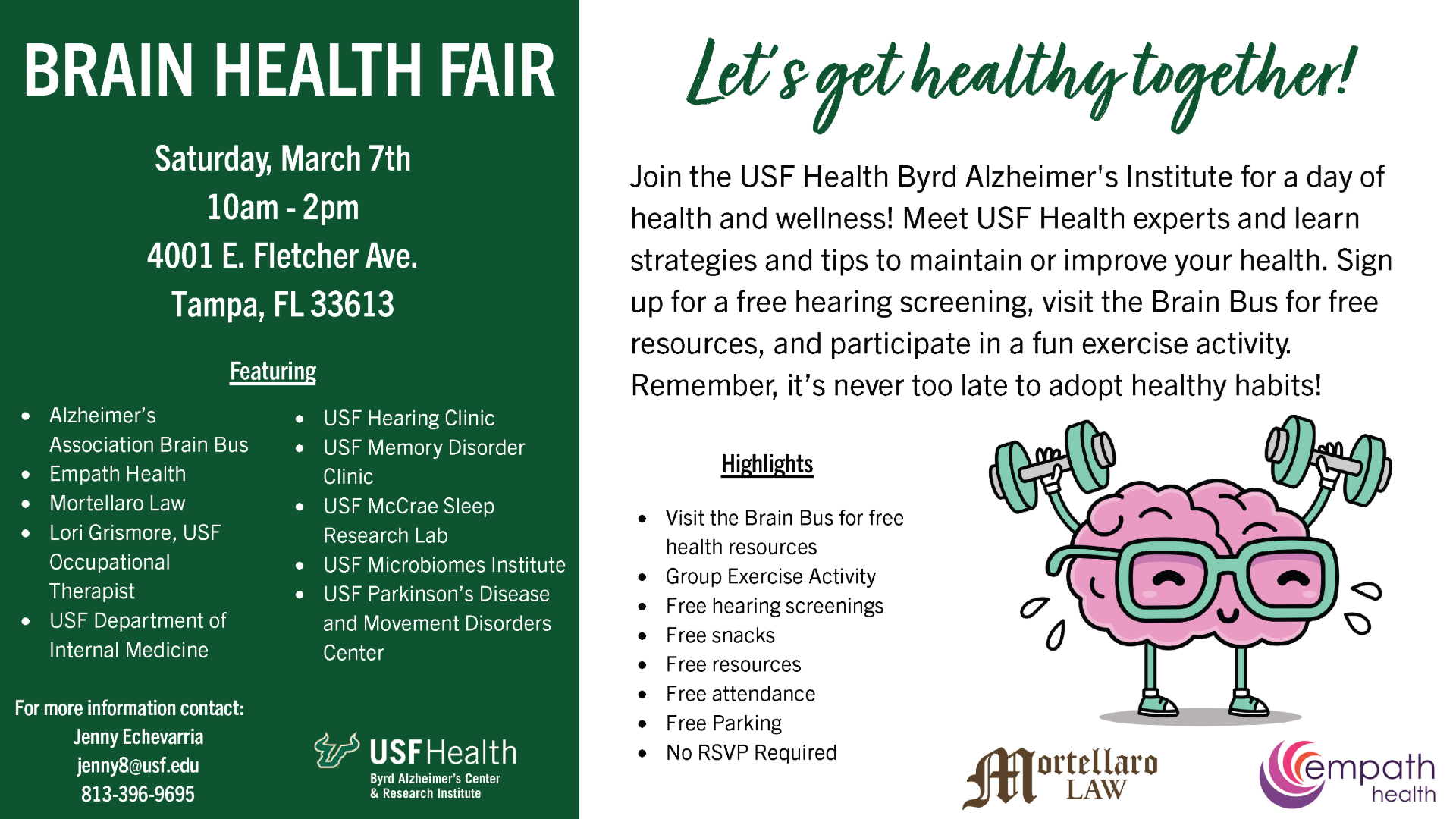 Join the USF Health Byrd Alzheimer's Institute for a day of health and wellness! Meet USF Health experts and learn strategies and tips to maintain or improve your health. Sign up for a free hearing screening, visit the Brain Bus for free resources, and participate in a fun exercise activity. Remember, it's never too late to adopt healthy habits!