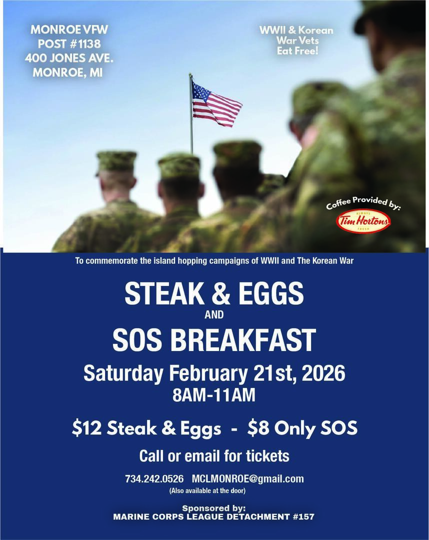 HomeEventsSteak, Eggs and SOS Breakfast Steak, Eggs and SOS Breakfast Saturday, February 21, 2026 8:00 AM - 11:00 AM 8:00 AM - 11:00 AM See all dates and Times 400 Jones Ave Parking Deals Get a Ride LYFT UBER Add to Calendar 02/21/2026 08:00 AM 02/21/2026 11:00 AM America/Atikokan Steak, Eggs and SOS Breakfast Breakfast to support the Marine Corps League and the programs that we support. The Young Marines, Toys for Tots and other veteran programs. Details & Tickets: https://www.upcomingevents.com/toledo/events/400-jones-ave/steak-eggs-and-sos-breakfast-600589?ref=uceaddevent 400 Jones Ave, 400 Jones Avenue, Monroe, MI, 48161 Set Reminder Categories Craft Beer, Food, Wine, Drink Specials Breakfast to support the Marine Corps League and the programs that we support. The Young Marines, Toys for Tots and other veteran programs.