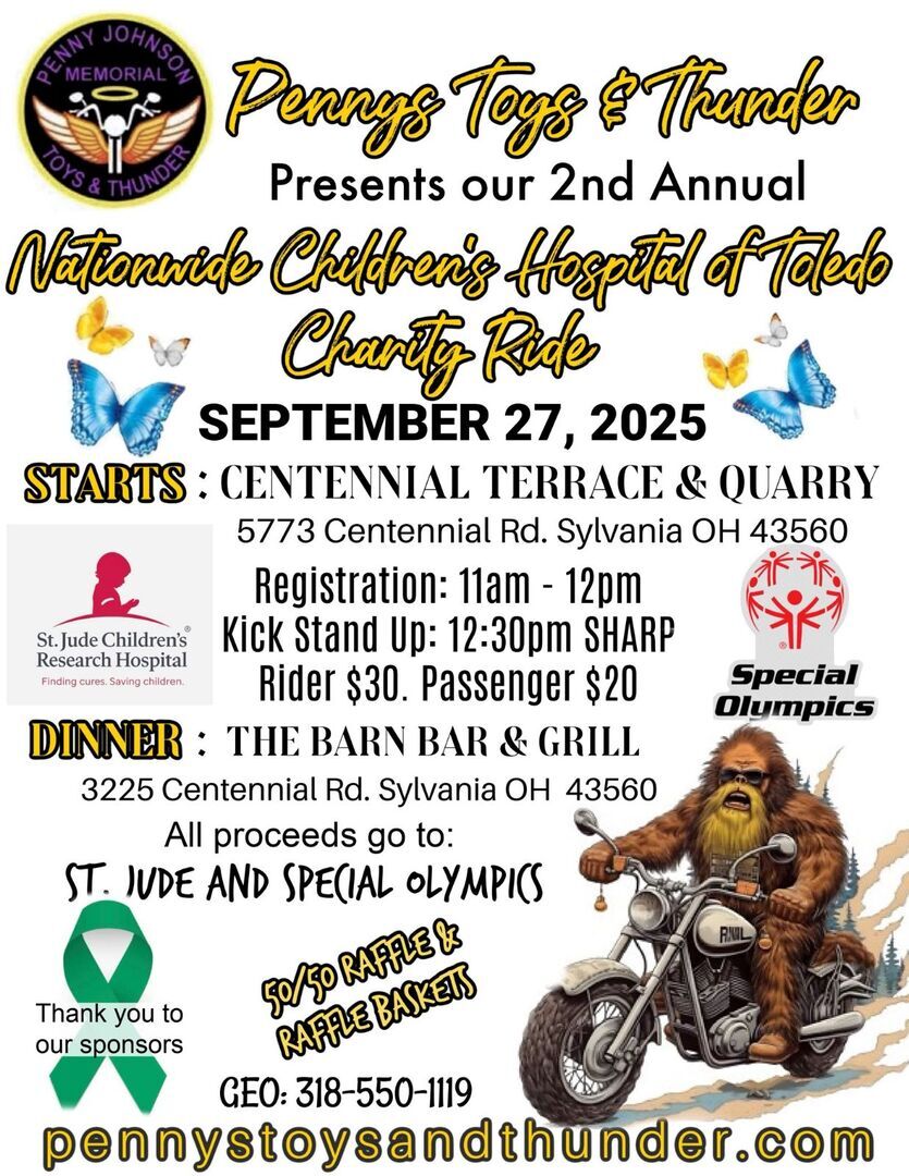 We’ll meet at Centennial Terrace at 11 am for registration and leave by 12:30 to head for the hospital to drop off a couple hundred stuffed animals and have some fun with the kids. They love to see all the bikes and hear the thunder as we come rolling in! Afterwards we’ll meet at the Barn Bar and Grill in Sylvania for a late lunch, raffles and live music!