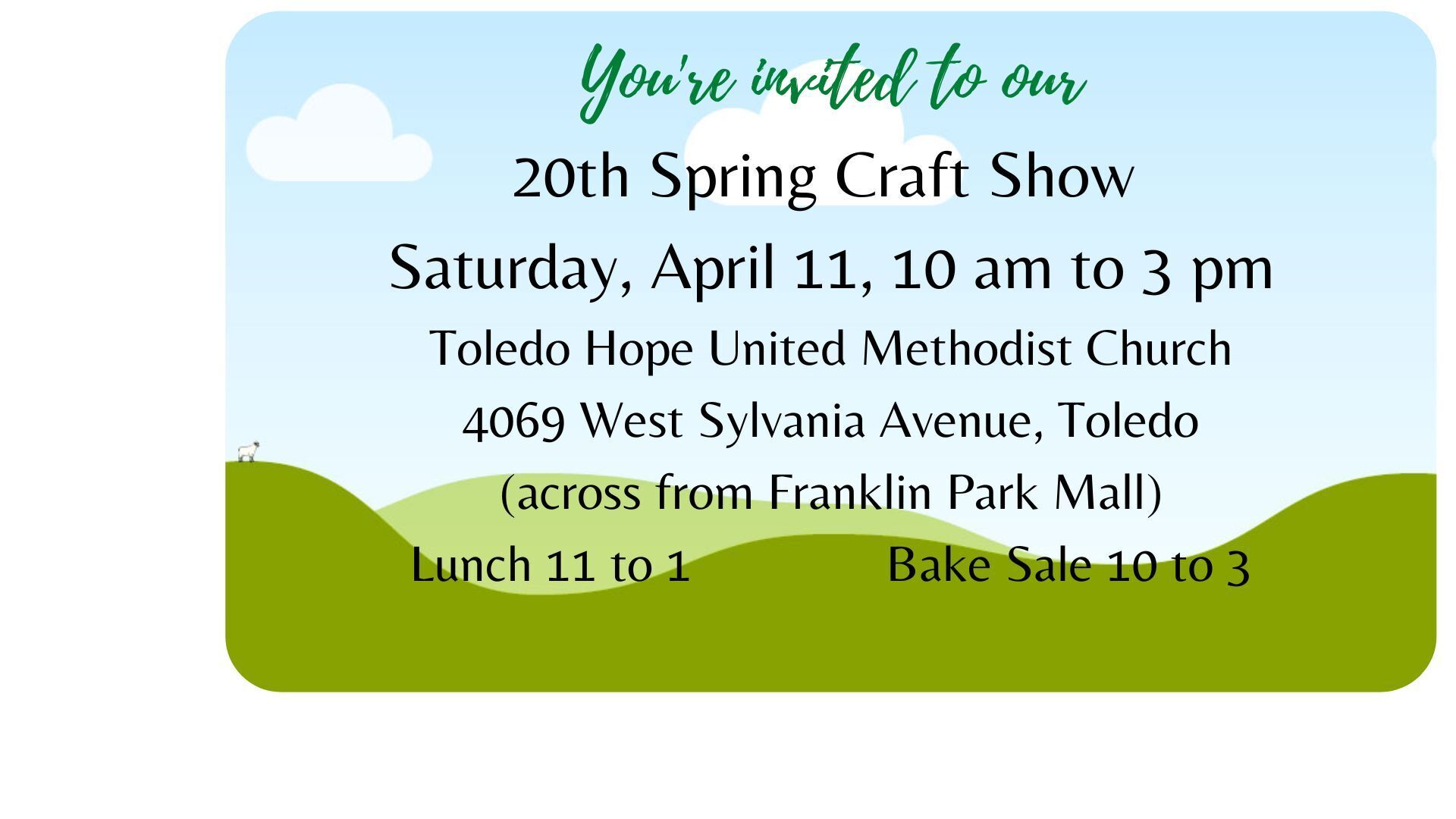 Join us at our 20th Spring Craft Show at Hope United Methodist Church, 4069 West Sylvania Ave. (across from Franklin Park Mall), Saturday, April 11, 10am to 3pm. Shop for unique crafts handmade by area crafters including jewelry, knit and crocheted items, wood works, greeting cards, kids’ toys and accessories, books by local authors, badge reels, pens, spring items, and lots more! Enjoy goodies from our bake sale. Homemade soups and sandwiches will also be available for purchase from 11 to 1. No admission fee.
