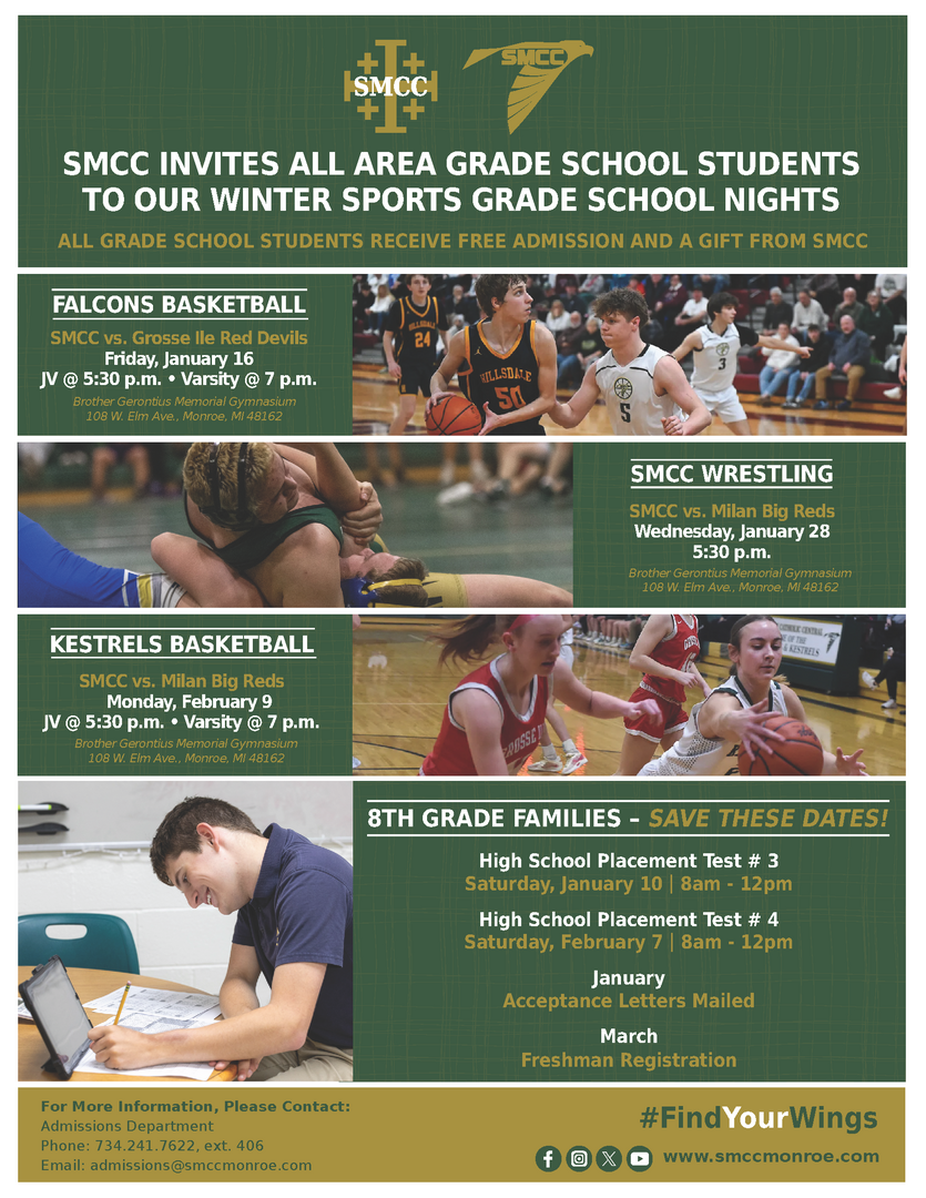 Mark your calendars for Wednesday, January 28, and join us for SMCC Wrestling Grade School Night! Experience the intensity and excitement as the SMCC Falcons take on the Milan Big Reds in a competitive dual you won’t want to miss.
