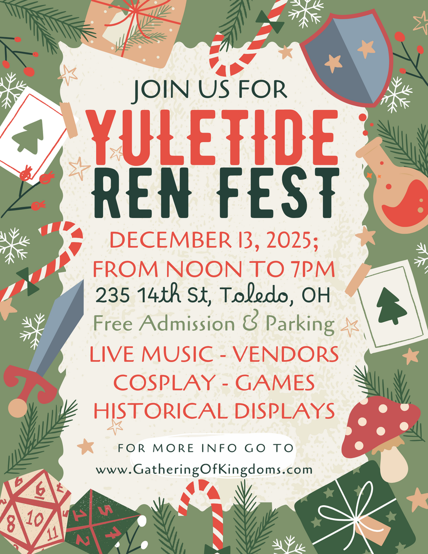 Don your favorite festive Ren Fest garb and join us for one magical afternoon with vendors, live music, bar service, and cheer as we celebrate the holidays at the Yuletide Mini NW Ohio Ren Fest! Huzzah!