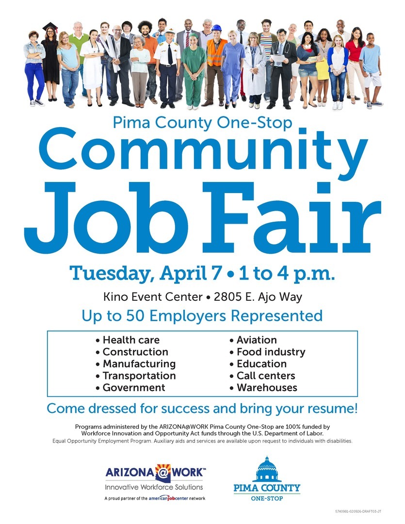 Join us on April 7 from 1:00–4:00 PM to connect with up to 50 employers from a wide variety of industries who are ready to hire. Whether you're looking for your first job, a career change, or new opportunities, this is your chance to meet employers face-to-face and take the next step toward employment. Bring your resume and come prepared to meet recruiters. Interviews may be possible. If you don't have a resume, please call Pima County One-Stop to schedule a time to make one. 520-724-7700