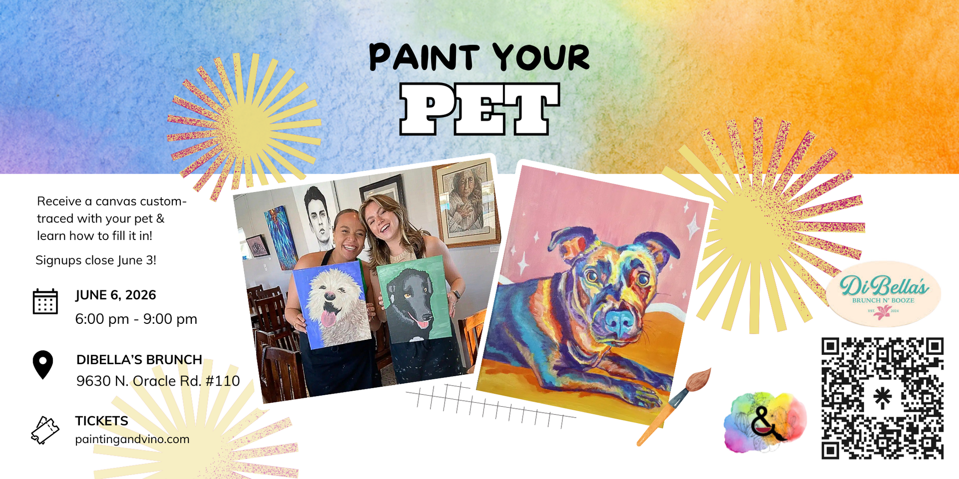 Join us for cocktails, dinner and pet art at Oro Valley DiBella’s! Get ready for a creative, fun-filled night of painting and socializing at this Paint Your Pet event! Whether you’re an experienced artist or just looking for a memorable experience, this pet portrait event promises an approachable, artistic activity.
