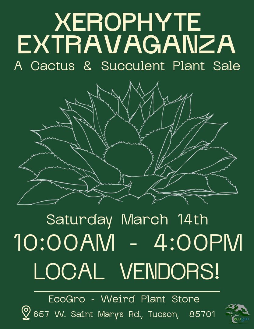 Calling all plant enthusiasts!! A Cactus Succulent and Plant Sale at EcoGro!! Weird, unusual, rare plants from all over the world. Incredible local potters with a large variety of unique pots and much more! Saturday March 14th 10am to 4pm in the EcoGro parking lot - 657 W Saint Mary's Rd.