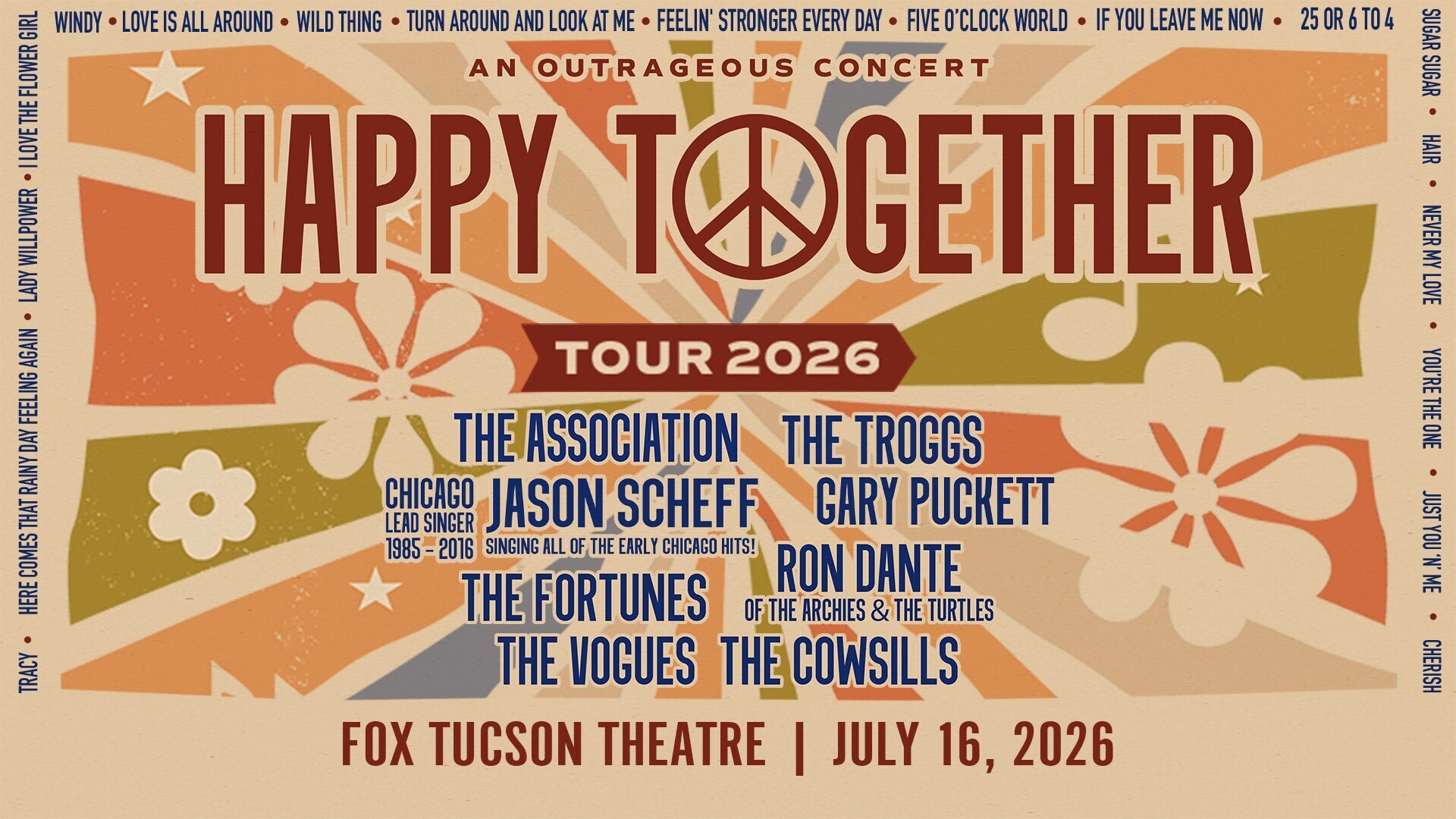 THE LINE-UP FEATURES RETURNING FAVORITES AND NEW ADDITIONS: THE ASSOCIATION, THE TROGGS, CHICAGO lead singer 1985-2016 JASON SCHEFF, GARY PUCKETT, THE FORTUNES, RON DANTE from The Archies and The Turtles, THE VOGUES and THE COWSILLS. 2026 will mark the 17th year of the highly successful, hit-filled summer package, THE “HAPPY TOGETHER” TOUR. The touring sensation that has crisscrossed the nation delighting audiences for over a decade and a half returns this summer with a show full of chart-topping hits from the ‘60s and ‘70s – an undeniable 60+ BILLBOARD Top 40 smashes. The Tour is once again joined by THE ASSOCIATION, THE TROGGS, CHICAGO lead singer 1985-2016 JASON SCHEFF, GARY PUCKETT, THE FORTUNES, RON DANTE from The Archies and The Turtles, THE VOGUES and THE COWSILLS.