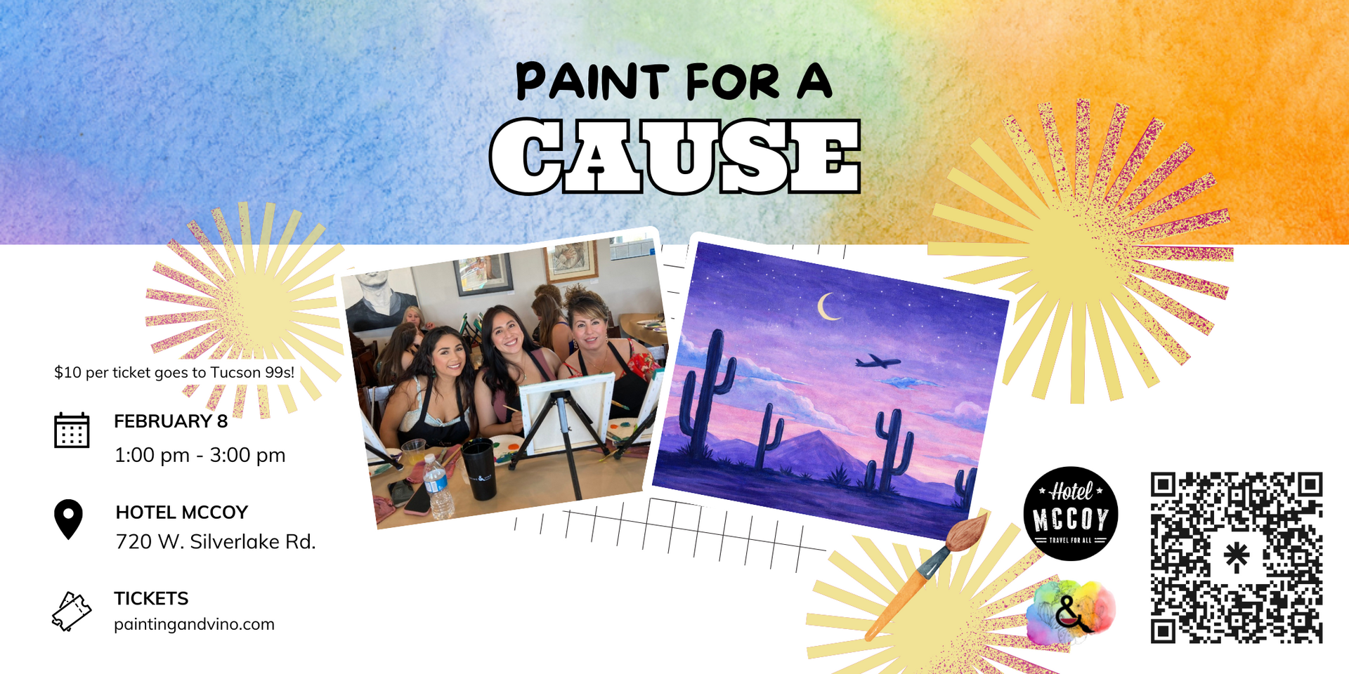 Please note your ticket is only for painting. Food and drink are available for purchase through Hotel McCoy. Indulge in a delightful selection of beverages, including mimosas, wine, beer, and non-alcoholic options. It’s the perfect opportunity to sip, relax, and connect with a date or friends and family. Click here for the drink menu.