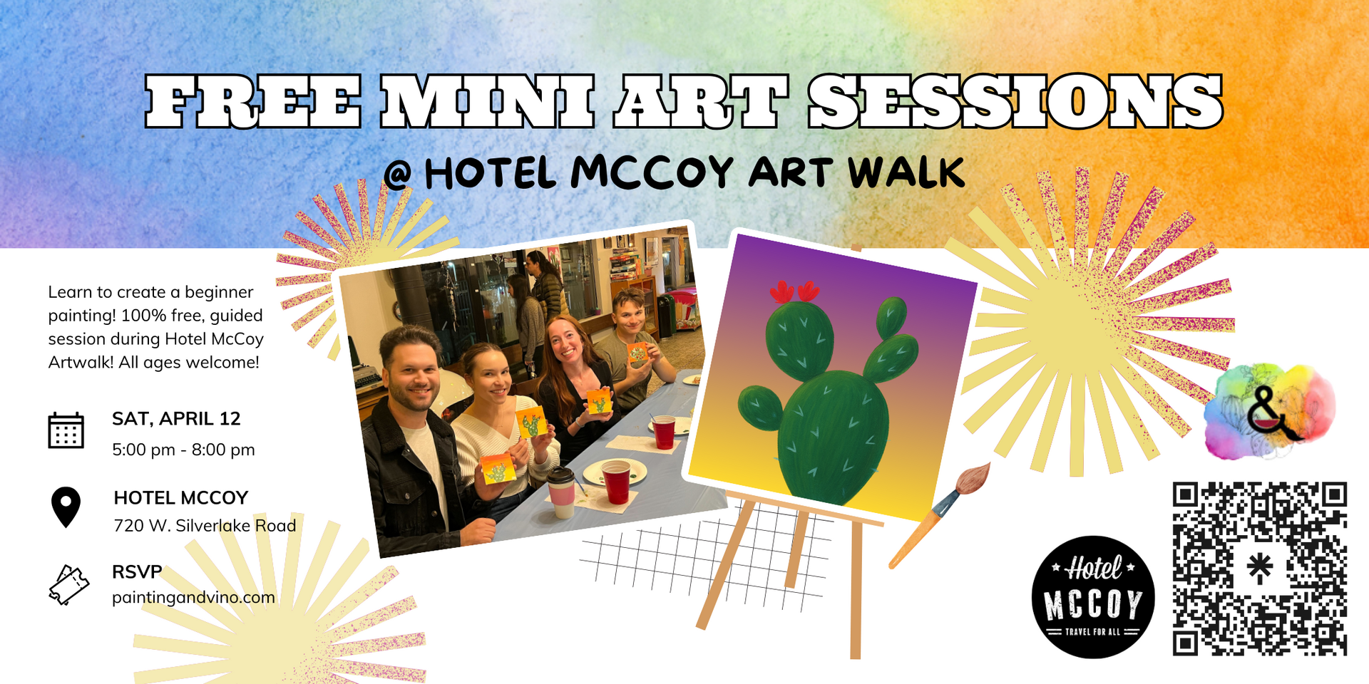Join us for 100% free mini-canvas sessions at Hotel McCoy Artwalk! Learn to paint a cactus on 4×4′′ canvas. Each session is 15 minutes long and led by instructor Kait. Spaces are first-come, first-serve.