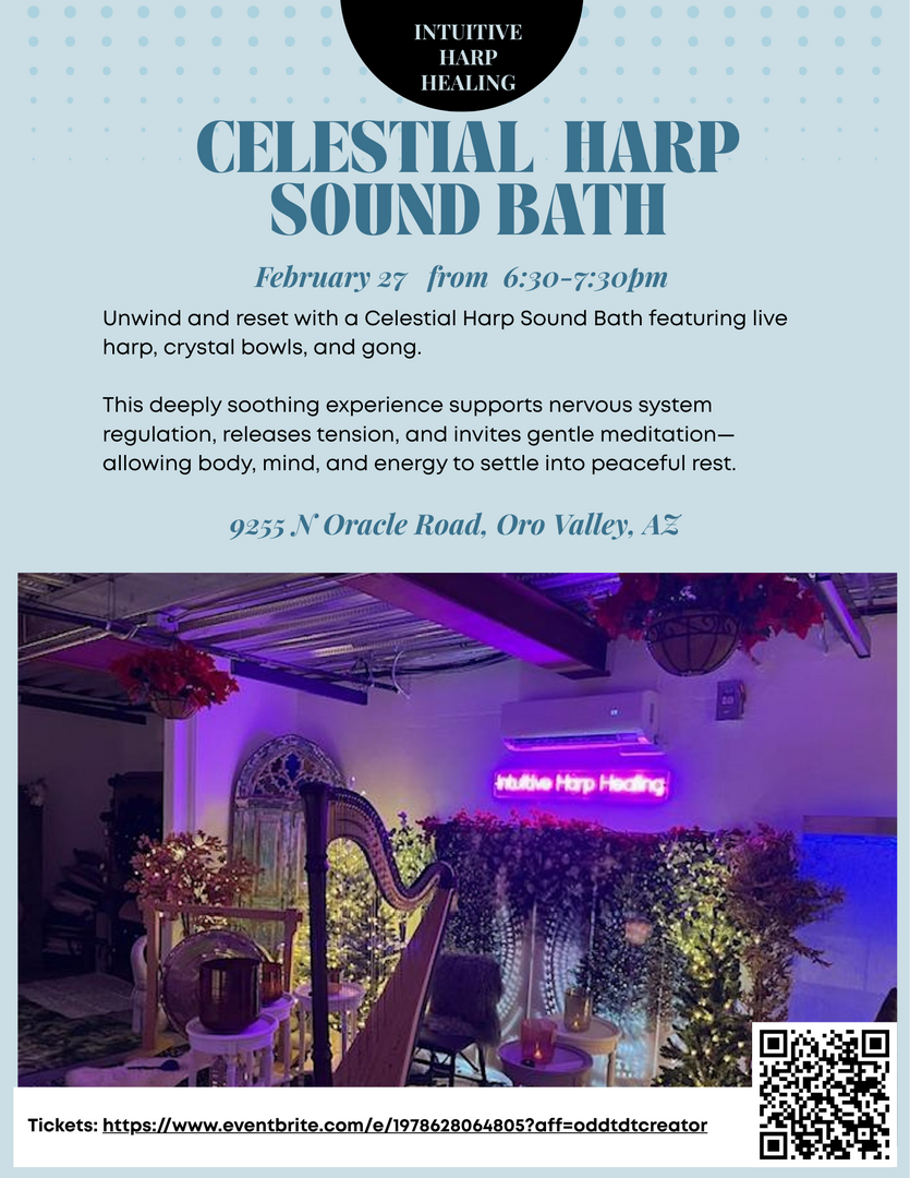 Join us for a restorative Celestial Harp Sound Bath, blending the gentle tones of live harp with crystal bowls and gong to create an immersive, soothing soundscape. This guided experience supports deep relaxation, nervous system regulation, and the release of tension in a calm, comforting environment.