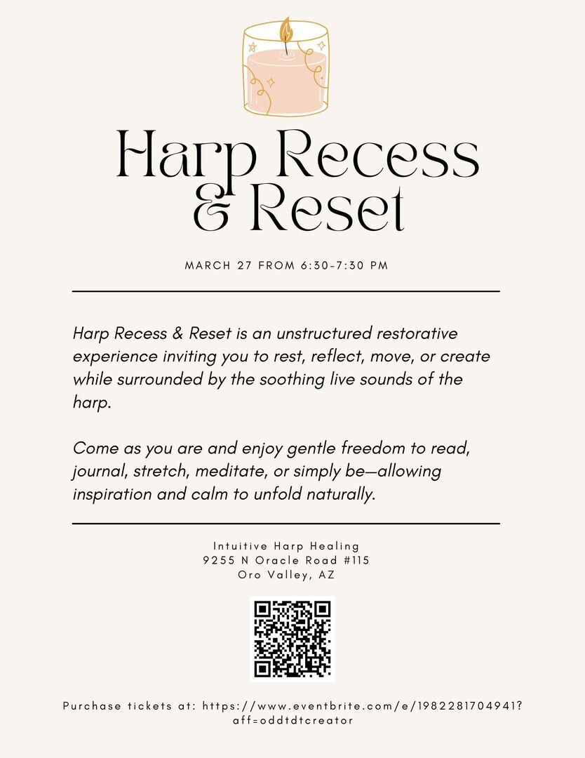 This is an invitation to come as you are. Choose an unstructured restorative activity that supports your vitality while being bathed in the beautiful tones of the harp in a quiet setting. This "free time" is an opportunity to rest, read, journal, color, dance, knit, write, meditate, explore your favorite yoga pose...or simply be inspired.