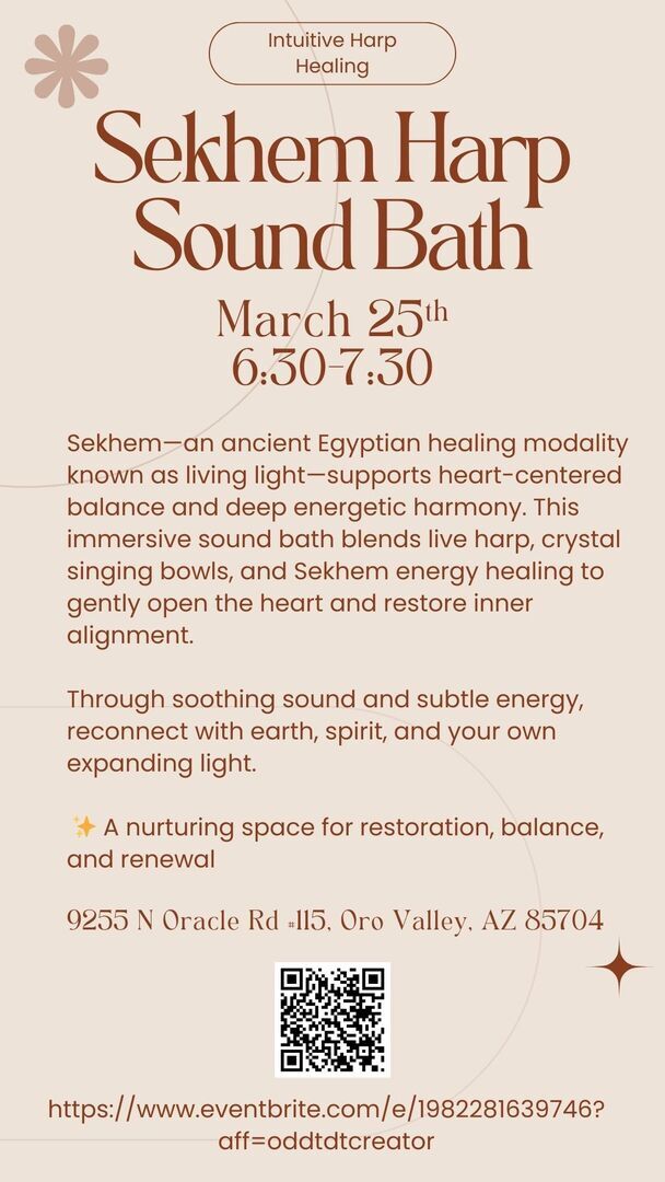 This immersive sound bath weaves together the soothing resonance of the harp, crystal singing bowls, and Sekhem energy healing to encourage a gentle yet profound opening of the heart. As the heart space awakens, a natural reconnection to the earth, the heavens, and spirit unfolds. Through this heart-opening process, participants may experience remembrance, receiving healing, insight, and expanding levels of light energy that support self-realization and inner balance. The harp’s calming vibrations guide the session, creating a meditative, nurturing environment for restoration, alignment, and renewal.