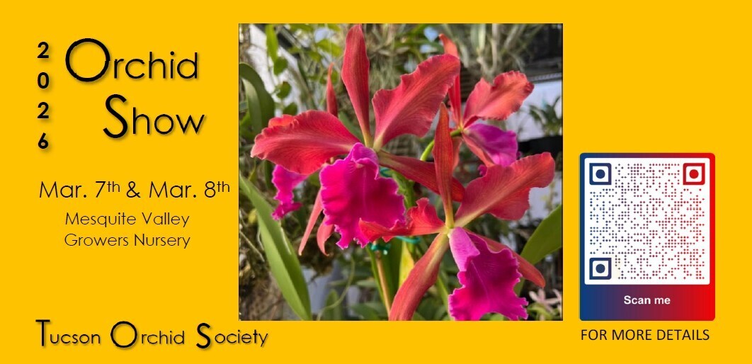 March 7th & 8th of 2026 the Tucson Orchid Society will host its annual Orchid Show and Sale. Come visit us at Mesquite Valley Growers (8005 E. Speedway Blvd. Tucson, Az) and experience the beautiful orchids grown by our members here in the desert southwest. We will also have unique orchids for sale not found locally and you can meet our growers and discover the secrets of growing Orchids in the Desert.