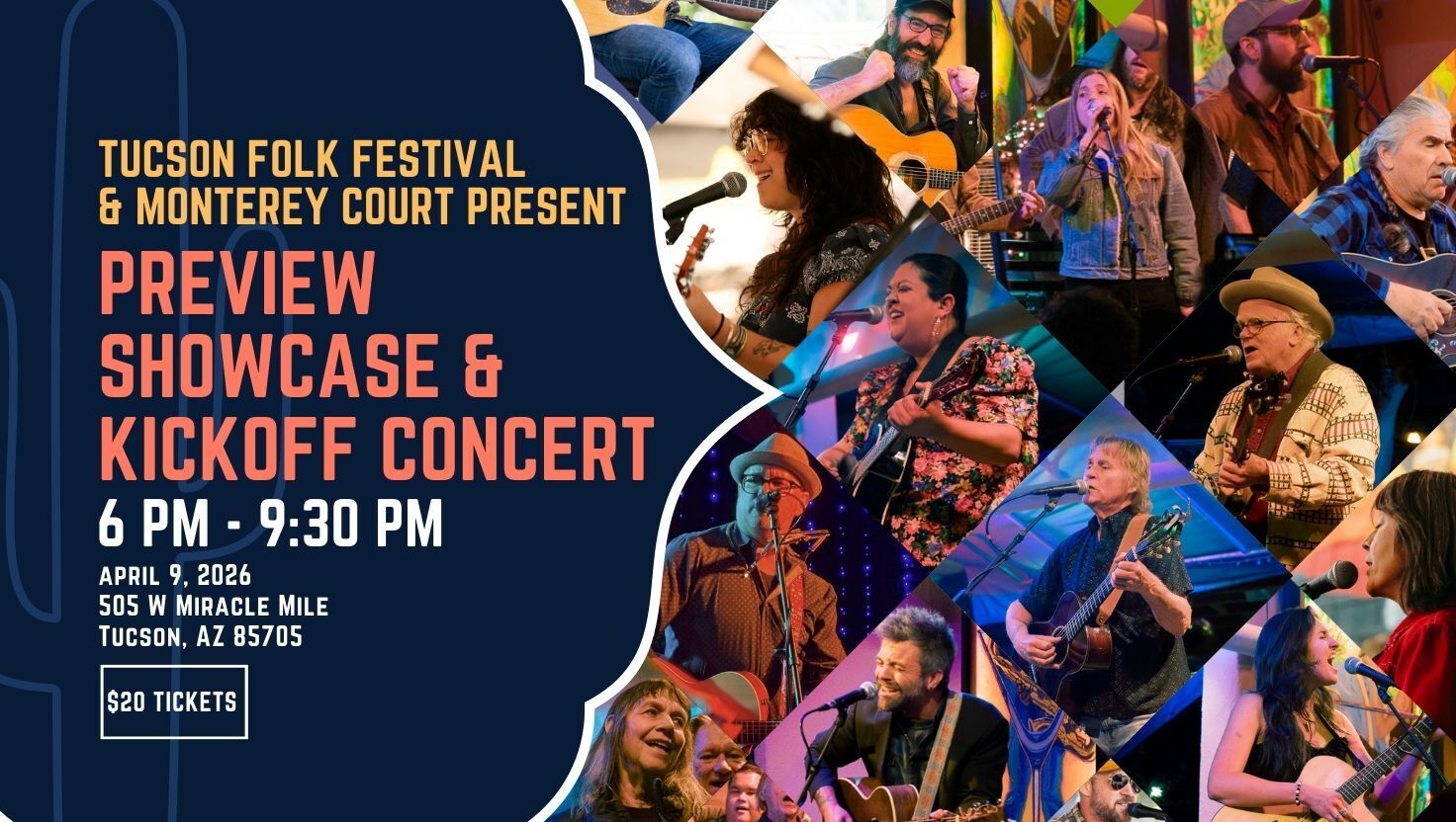 The fourth annual collaboration between the Tucson Folk Festival and Monterey Court hosting an official preview party and festival kickoff event is happening! Join us on Thursday, April 9 at the Monty from 6 PM - 9:30 PM with an all-star lineup of festival favorites and Tucson music staples. $20 admission fee.