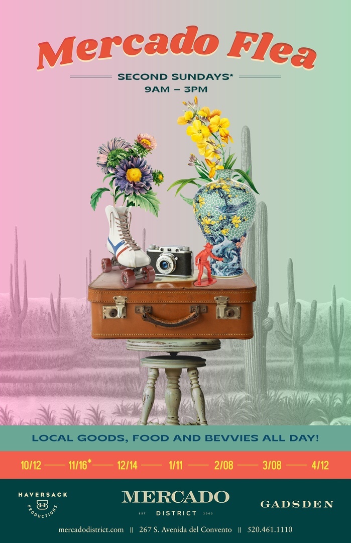 The Mercado Flea is back for its 8th season this year! This beloved monthly Tucson event features over 65+ local vendors coming together to sell antiques, vintage items, collectibles, and treasures. Vendors and visitors alike line the bustling sidewalks, avenidas, and storefronts all throughout the Mercado District for the Flea. There’s a lounge and DJ inside the Annex where you can unwind and relax as well inbetween shopping. The Mercado Flea is always family-friendly, pet-friendly, and a welcoming community for any and all to gather—there’s a little something for everyone! The Mercado Flea is the 2nd Sunday of each month October-April from 9am-3pm in the Mercado District.