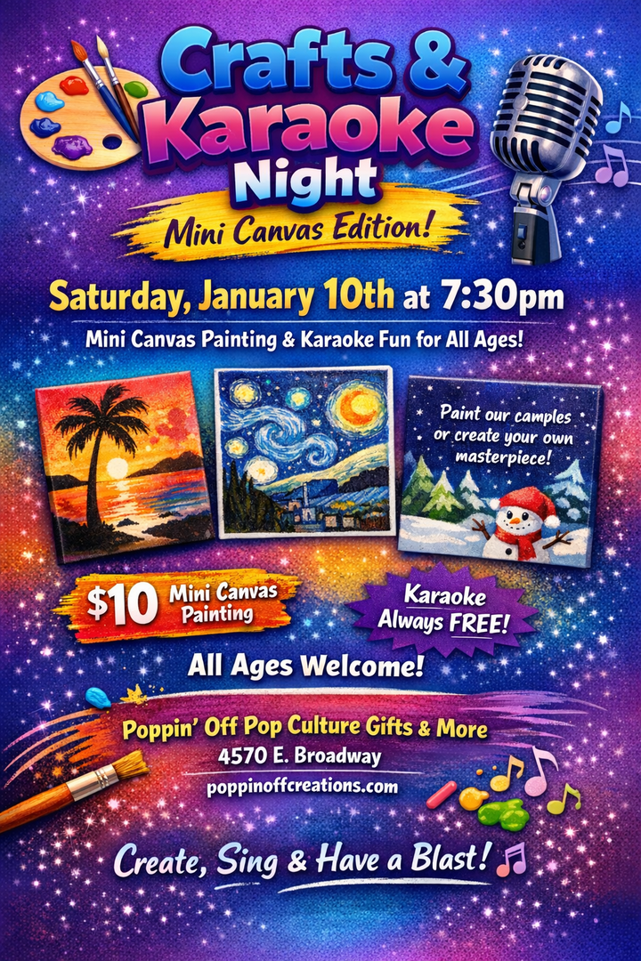 Clear your throat, grab a brush, and get ready for a night where art and karaoke collide in the best possible way. Join us Saturday, January 10th at 7:30pm for our January Crafts & Karaoke Night, featuring mini canvas painting and all-ages sing-along fun!