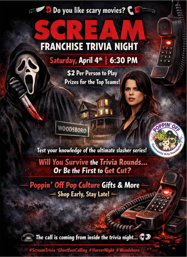 #PoppinOffPopCulture #TriviaNight #ScreamTrivia #HorrorFans #GhostfaceCalling #PopCultureEvents #Woodsboro #FinalGirlEnergy