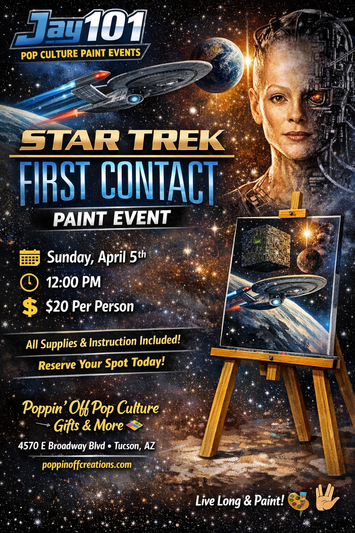 Attention Starfleet cadets, Klingon warriors, and curious explorers of the final frontier! Itโs time to boldly go where your paintbrush has never gone before. Join us at Poppinโ Off Pop Culture Gifts & More for our next Jay101 Pop Culture Paint Event, inspired by Star Trek: First Contact.
