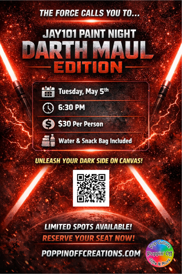 Ready to tap into your dark side (artistically speaking)? Join us for an electrifying paint night where we bring the fierce and unforgettable Darth Maul to life on canvas. Whether youβre a seasoned painter or just here for the vibes, this is your chance to create something bold, dramatic, and seriously cool.