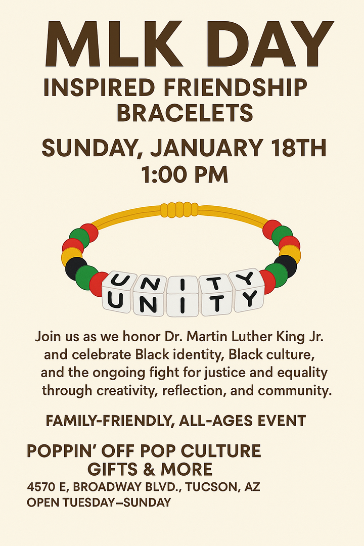 Join us at Poppin’ Off Pop Culture Gifts & More as we honor Dr. Martin Luther King Jr. and celebrate Black identity, Black culture, and the ongoing fight for justice and equality through creativity, reflection, and community.