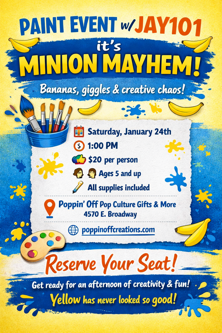 Bananas, giggles, and bright yellow chaos are taking over Poppinβ Off! Join us for another fun-filled Paint Event w/ Jay101 on Saturday, January 24th at 1:00 PM, where weβll be painting everyoneβs favorite mischievous little helpers: the Minions!