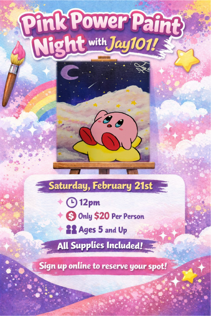 Get ready to paint the roundest hero in gaming! Join us for our next Jay101 Paint Event on Saturday, February 21st at 12pm, where weβll be bringing Kirby to life on canvas πποΈ