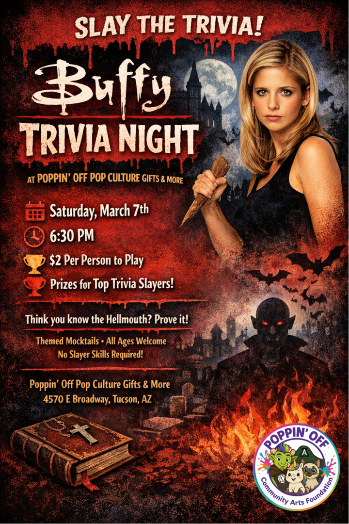 Grab your stakes, sharpen your wit, and assemble your Scooby Gang because Buffy Trivia Night is coming to Poppin’ Off Pop Culture Gifts & More!