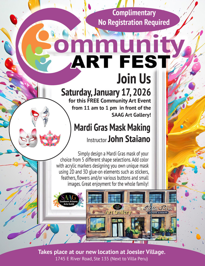 Craft your Mardi Gras mask at the SAAG Gallery’s Community Art Fest. Saturday January 17; 11-1. NEW LOCATION: Joesler Village, 1745 East River Road, Suite 135, next to Villa Peru (River & Campbell). The event is free. All materials provided. No registration required. Community Art Fest is held on the 3rd Saturday of the month through June.