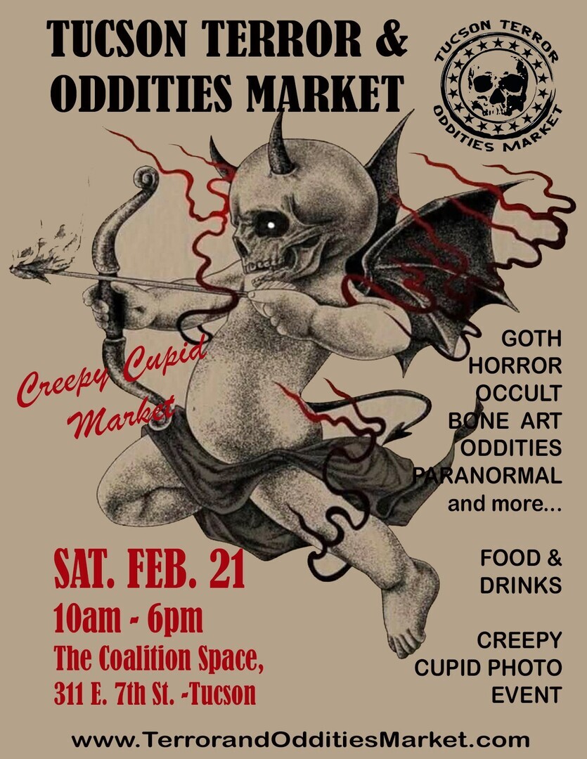 Fall in love with the strange at this dark Valentine market featuring 40 shoppes featuring horror, goth goods, true crime, oddities, books, bone art, paranormal finds, occult treasures, and more. Fuel your descent with enticing treats, decadent hot drinks, fortune telling, and wickedly creepy photo ops lurking around every corner.
