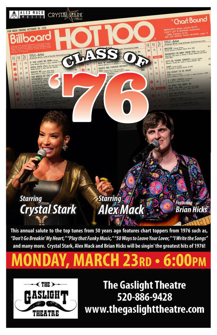 HomeEventsClass of 76 *Alex Mack and Crystal Stark* Class of 76 *Alex Mack and Crystal Stark* Saturday, March 21, 2026 6:00 PM - 8:00 PM 6:00 PM - 8:00 PM See all dates and Times The Gaslight Music Hall Parking Deals Get a Ride LYFT UBER Add to Calendar 03/21/2026 06:00 PM 03/21/2026 08:00 PM America/Boise Class of 76 *Alex Mack and Crystal Stark* Join Alex Mack and Crystal Stark for this annual salute to the top tunes from 50 years ago! Event LinksTickets: https://go.evvnt.com/3523540-0 Details & Tickets: https://www.upcomingevents.com/tucson/events/the-gaslight-music-hall/class-of-76-alex-mack-and-crystal-stark-616791?ref=uceaddevent The Gaslight Music Hall, 13005 North Oracle Road, Tucson, AZ, 85739 Set Reminder Categories Indoor / Outdoor Event, Live Entertainment, Live Performance, Performing Arts Join Alex Mack and Crystal Stark for this annual salute to the top tunes from 50 years ago! Event LinksTickets: https://go.evvnt.com/3523540-0