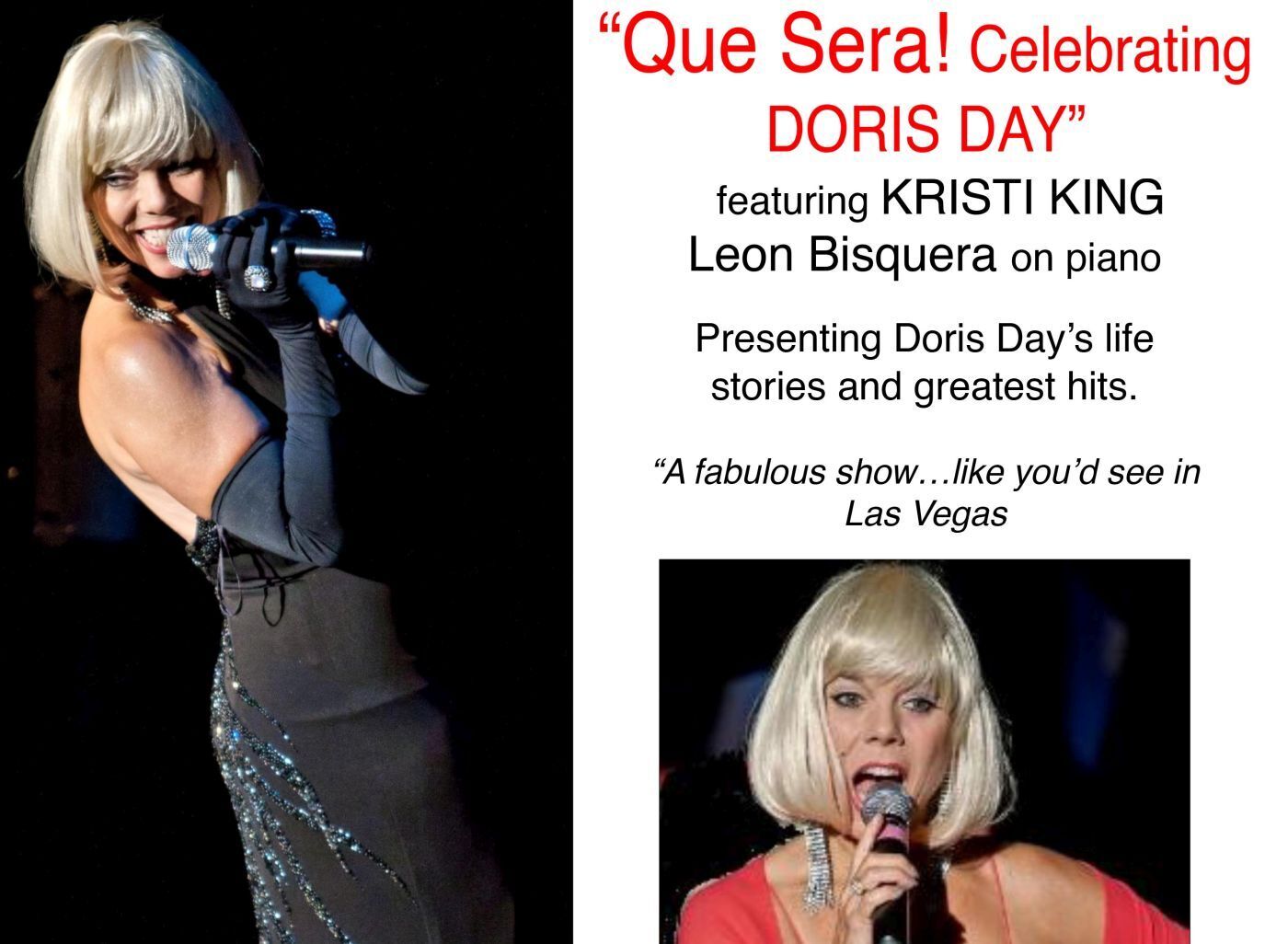 A Doris Day tribute concert often evokes a sense of nostalgia, showcasing her iconic hits and playful personality. Audiences can expect to hear beloved songs like "Que Sera, Sera," "Sentimental Journey," and "Secret Love," alongside selections from her famous movie musicals. Performers often capture her unique vocal style, including her ability to seamlessly transition between registers and her skillful use of consonants. Beyond the music, concerts often highlight Day's charming on-screen persona and her later role as a passionate animal rights advocate. Starring Kristi King.