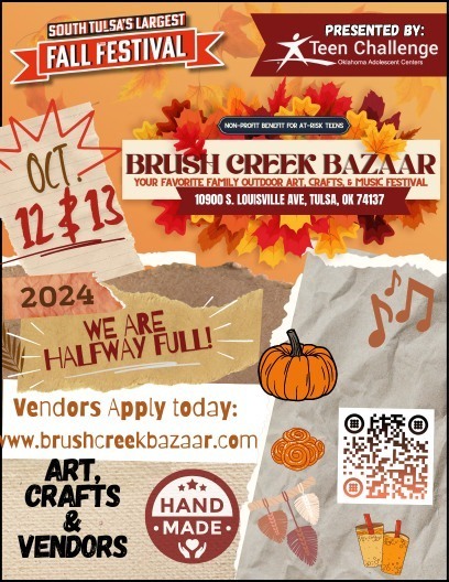 The Annual Brush Creek Bazaar is back and better than ever for its 46th year! This October 12th & 13th and join us for two days of fantastic music, delicious food, exciting fun, and a showcase of the most talented local artists! Don't miss out on this amazing opportunity to help benefit the youth Oklahoma Teen Challenge! Apply or Help now at www.brushcreekbazaar.com #BrushCreekBazaar #LocalArtists #TulsasFavoriteFallFestival