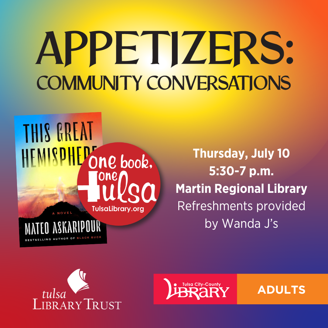 Join us to discuss “This Great Hemisphere” by Mateo Askaripour in anticipation of his visit to Central Library for One Book, One Tulsa on July 18. Refreshments provided by Wanda J's.