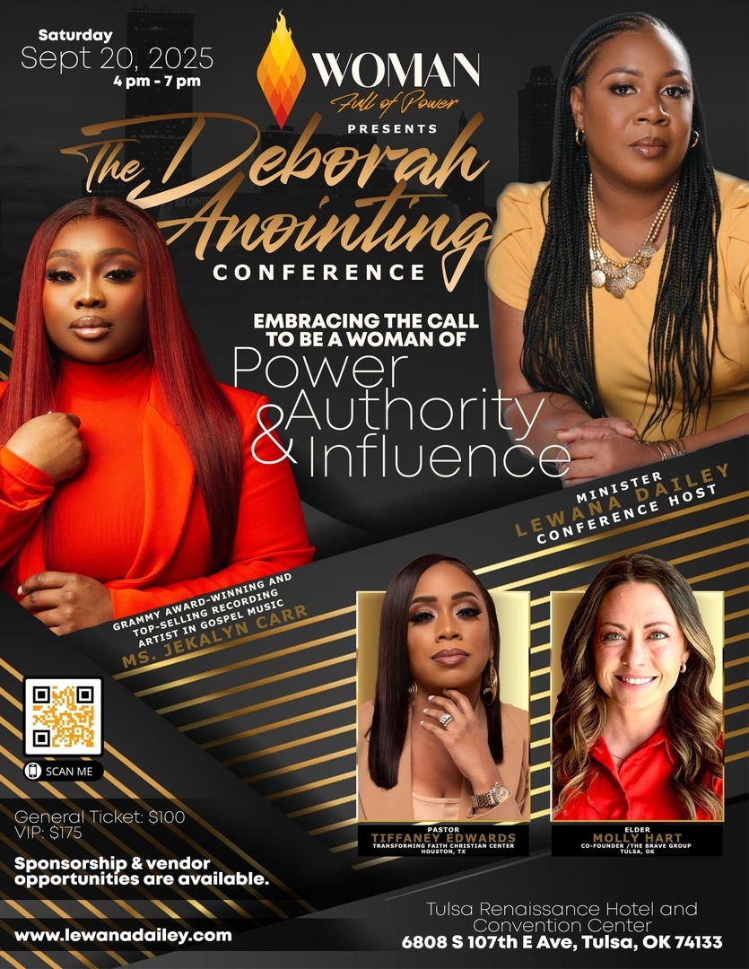 Woman Full of Power - Deborah Anointing Conference: Embracing the Call to Be a Woman of Power, Authority, and Influence will be a transformative event designed to empower and equip women to walk in boldness, power, and divine authority in their businesses, ministries, and communities. This event is scheduled for Saturday, September 20, 2025 at Tulsa Renaissance Hotel and Convention Center, and we will close-out with a guest appearance and impartation from Grammy award-winning and top-selling recording artist in Gospel Music, Ms. Jekalyn Carr.