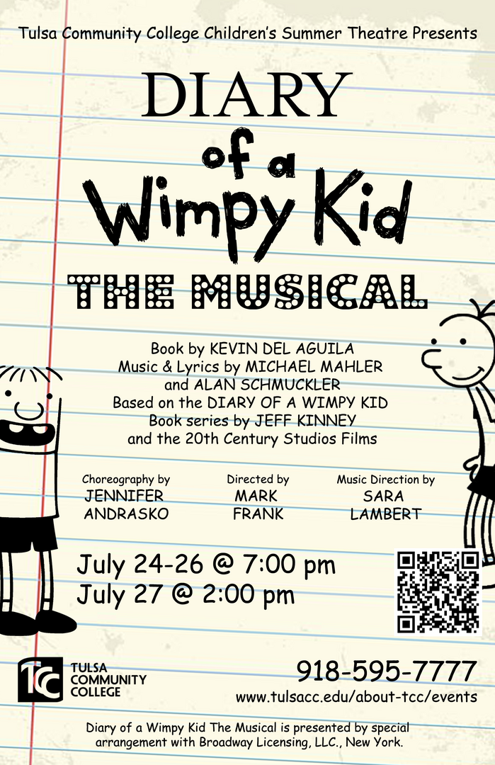 Ready to laugh your way through middle school again? TCC Theatre’s Tulsa Children’s Summer Theatre is thrilled to present Diary of a Wimpy Kid: The Musical, a laugh-out-loud and heartfelt stage adaptation of Jeff Kinney’s bestselling book series! Book by Kevin Del Aguina and Music and lyrics by Michael Mahler and Alan Schmuckler. The musical is directed by Mark Frank and musical direction by Sara Lambert and choreography by Jennifer Andrasko.