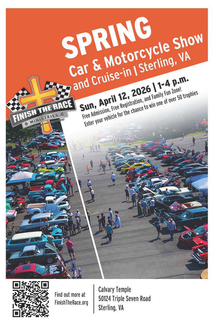 The 2026 Spring FTR Car & Motorcycle Show is an event for Car & Motorcycle enthusiasts of all ages on Sunday April 12, 2026 from 1-4 PM. Held on the grounds of Calvary Temple Church 50214 Triple Seven Road, Sterling, VA 20165, The 2026 Spring FTR Car & Motorcycle Show is an event for Car & Motorcycle enthusiasts of all ages. Held on the grounds of Calvary Temple Church there is something for everyone. Come on out and show off your Car or Motorcycle or just enjoy strolling the grounds and admiring the over 200+ vehicles and motorcycles expected to show up. All makes and models are welcome! Free trailer parking. FREE Registration! FREE Admission! Food and other vendors! Kids Zone with lots of games and activities for kid's and "big" kids! If you are an interested Vendor, please fill out the form on http://finishtherace.org/carnews.html Any questions send an email to [email protected]. You can register at: http://finishtherace.org/carnews.html