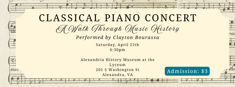 Clayton Bourassa will perform a classical piano concert featuring compositions from Bach, Beethoven, Chopin, Liszt, Rachmaninoff, and Gershwin. Clayton will provide an introduction to each piece, highlighting the classical music characteristics of the time period. Concert will last roughly one hour, including one intermission.