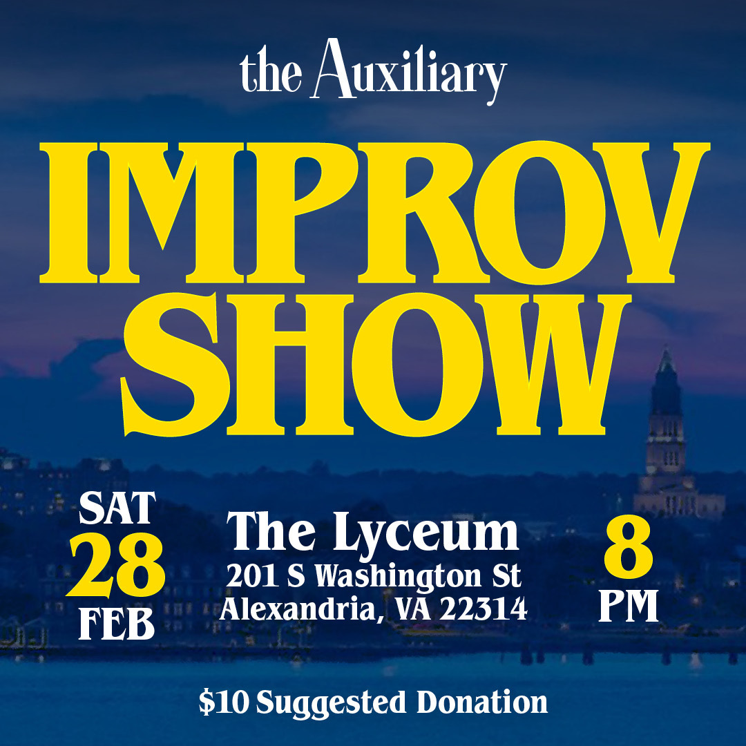 Join the Auxiliary Improv for an evening of made-up-on-the-spot improv comedy! We'll be calling on you to give us suggestions for a totally unique show that'll never be seen again!