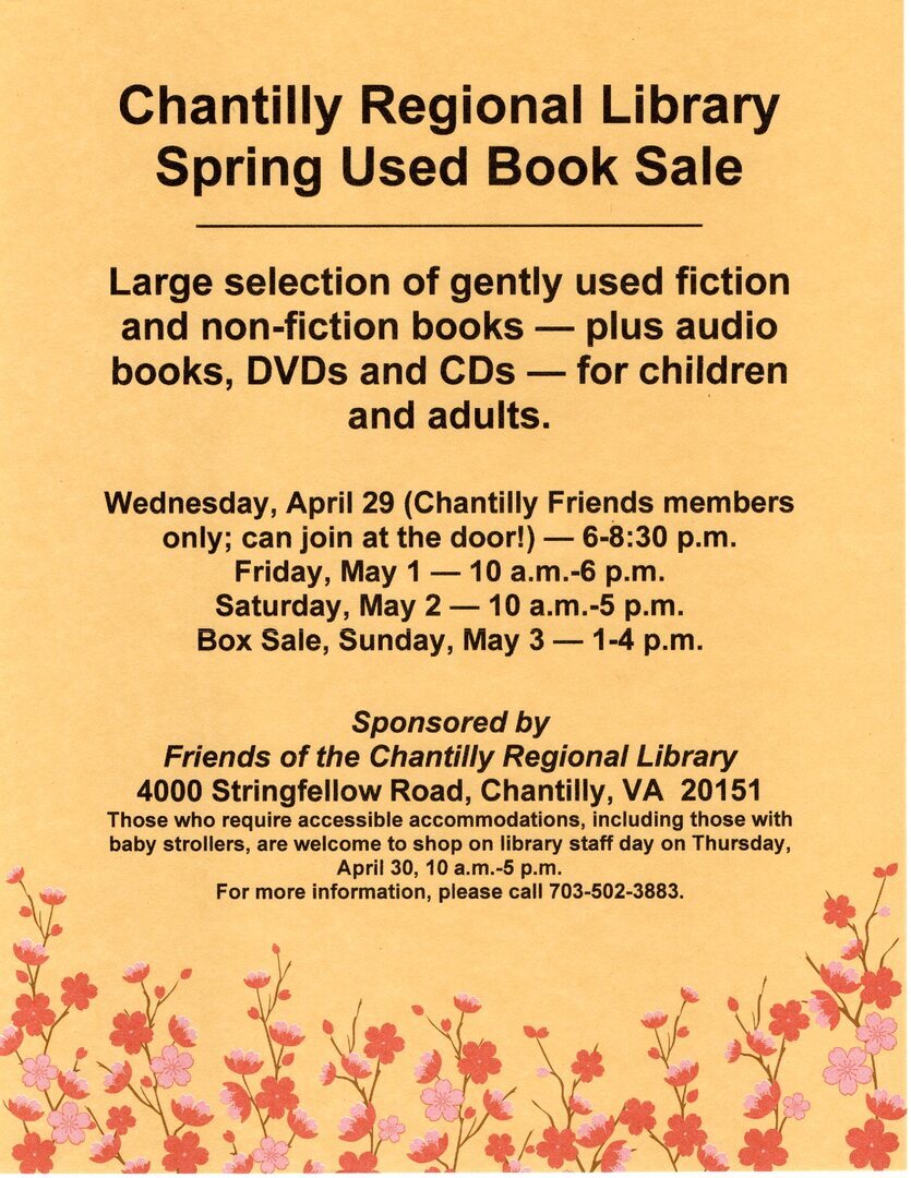 In addition to adult and children’s fiction, the sale will feature an assortment of non-fiction in every category: history, art, textbooks, cooking, gardening, decorating, crafts, business, travel, religion, self-help, science and nature, and sports and fitness. Sale proceeds fund special programs, renovation projects, children’s activities, landscape maintenance and new equipment for the library. For more information or reasonable accessible accommodations, please call the library at 703-502-3883 or visit www.fairfaxcounty.gov/library/events.