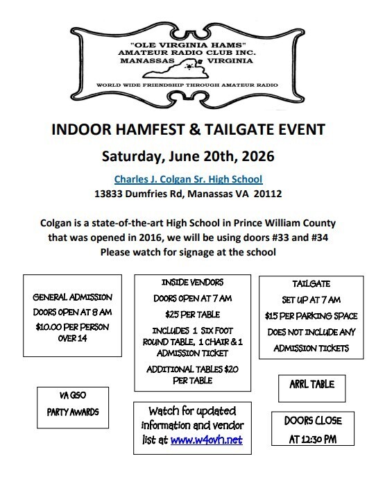 VE Testing Session, Virginia QSO Party Awards Ceremony, Indoor vendors, Tailgate in the parking lot, $10 admission fee for 14 and over