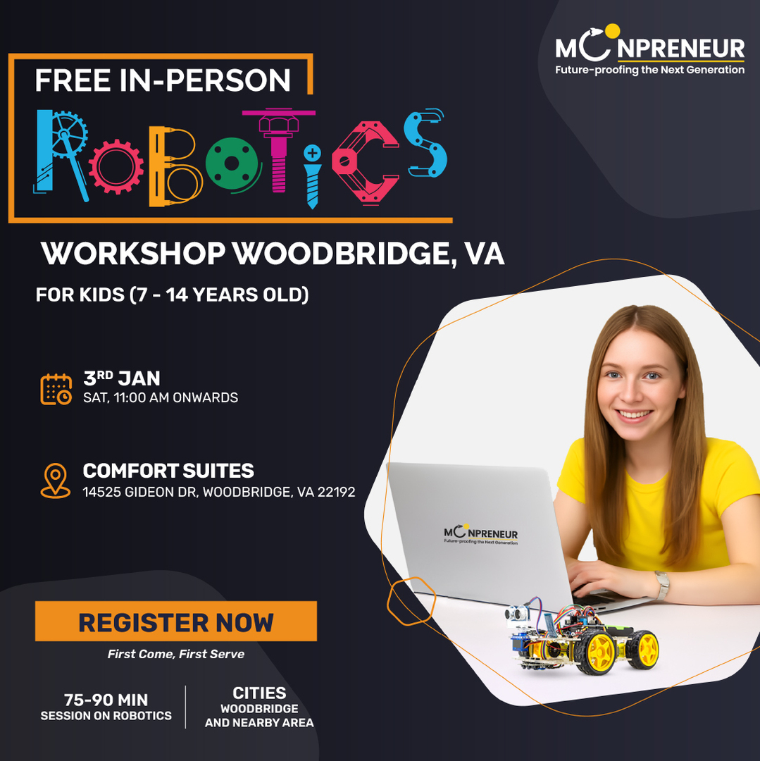 Moonpreneur extends a warm invitation to you and your child for our upcoming free in-person robotics workshop at Woodbridge, VA on 3rd January, Saturday at 11:00 AM EST.