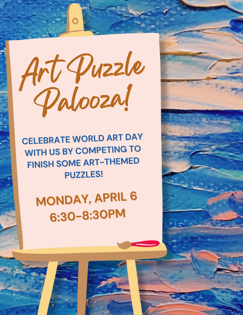 Celebrate World Art Day with an evening of puzzling using puzzles inspired by famous artworks! Spend your time enjoying a leisurely puzzle or compete in a speed-puzzling challenge! Register if you'd like an email reminder. Adults.