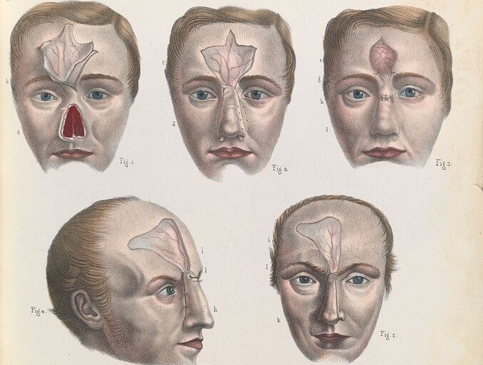 Image: Reconstructive facial surgery as illustrated by Jean Baptiste Marc Bourgery in the late 1840s (Wellcome Collection / public domain).