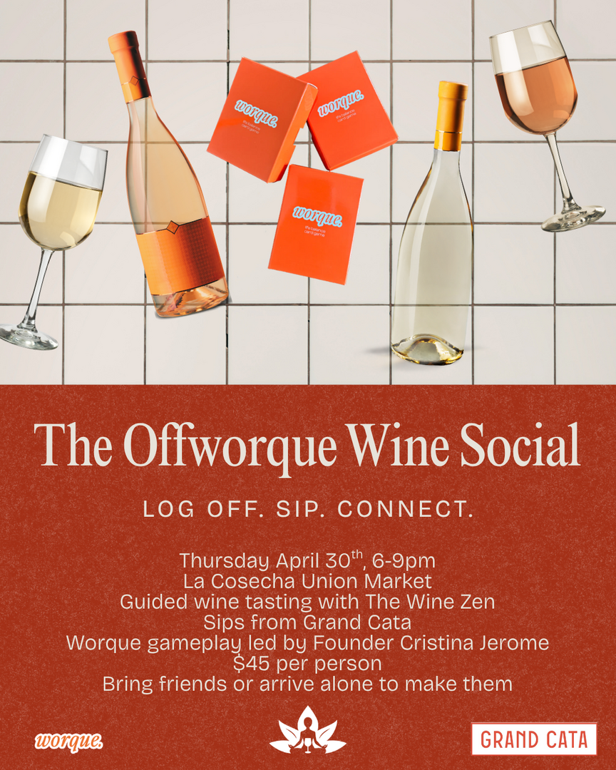 We will keep the energy light and social with a mix of wine pours and the worque/life balance card game, moving through a few playful rounds with founder Cristina Jerome that make it easy to meet new people and actually enjoy being off the clock.